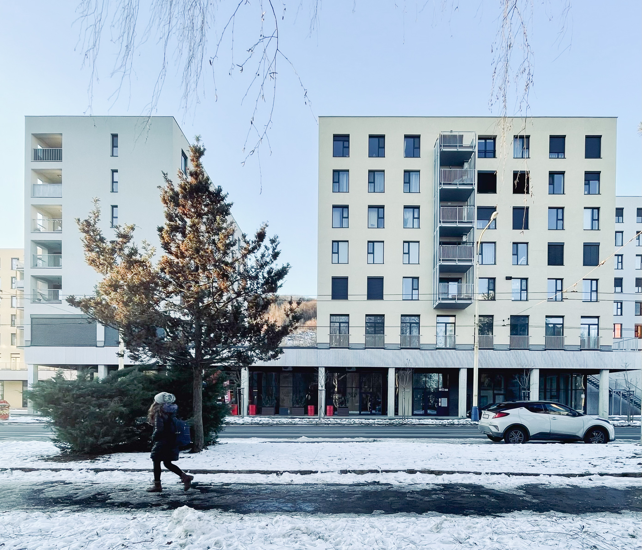 Navrhovaný objekt je hmotovo organizovaný do jednopodlažnej podstavy s občianskou vybavenosťou. Z nej v pravideľných rozostupoch a rôznych natočeniach vyrastajú štyri, takmer identické vežové objekty so siedmimi nadzemnými podlažiami. V nich budú na druhom nadzemnom podlaží umiestnené priestory administratívneho charakteru. Ostatné podlažia budú rezidenčné. V objekte budú 2, 3, 4 a 5 izbové byty. Všetky byty majú loggiu.