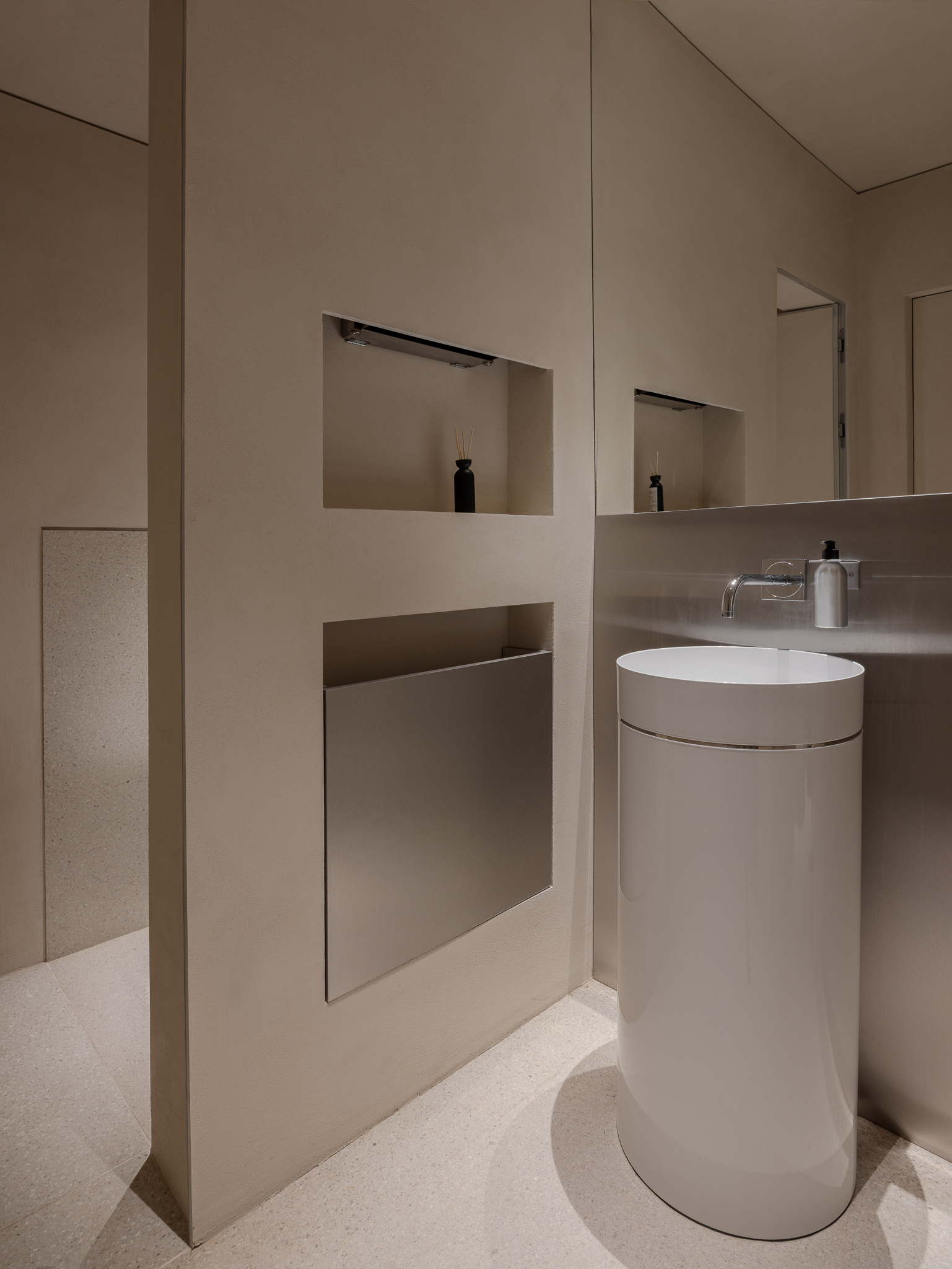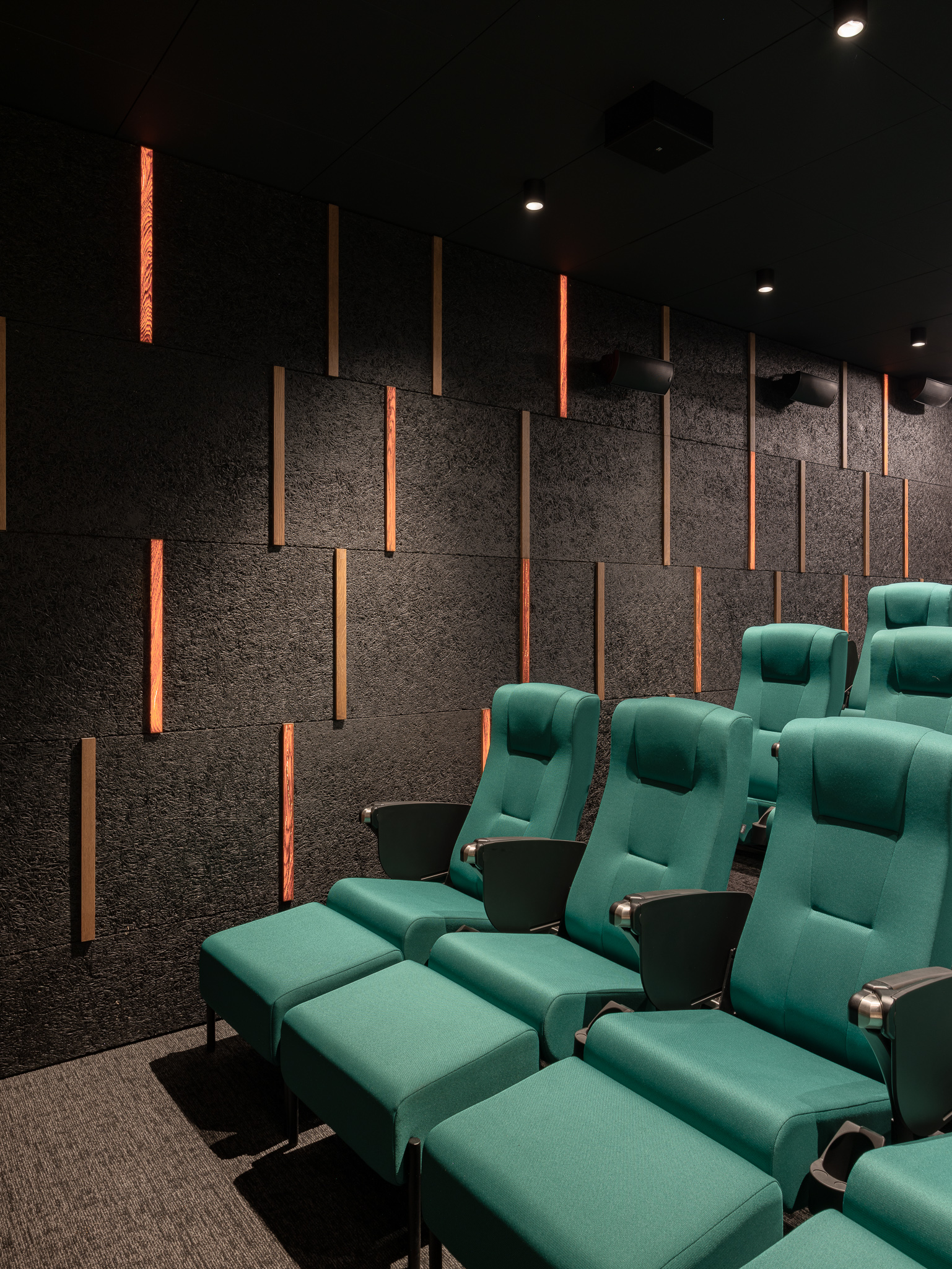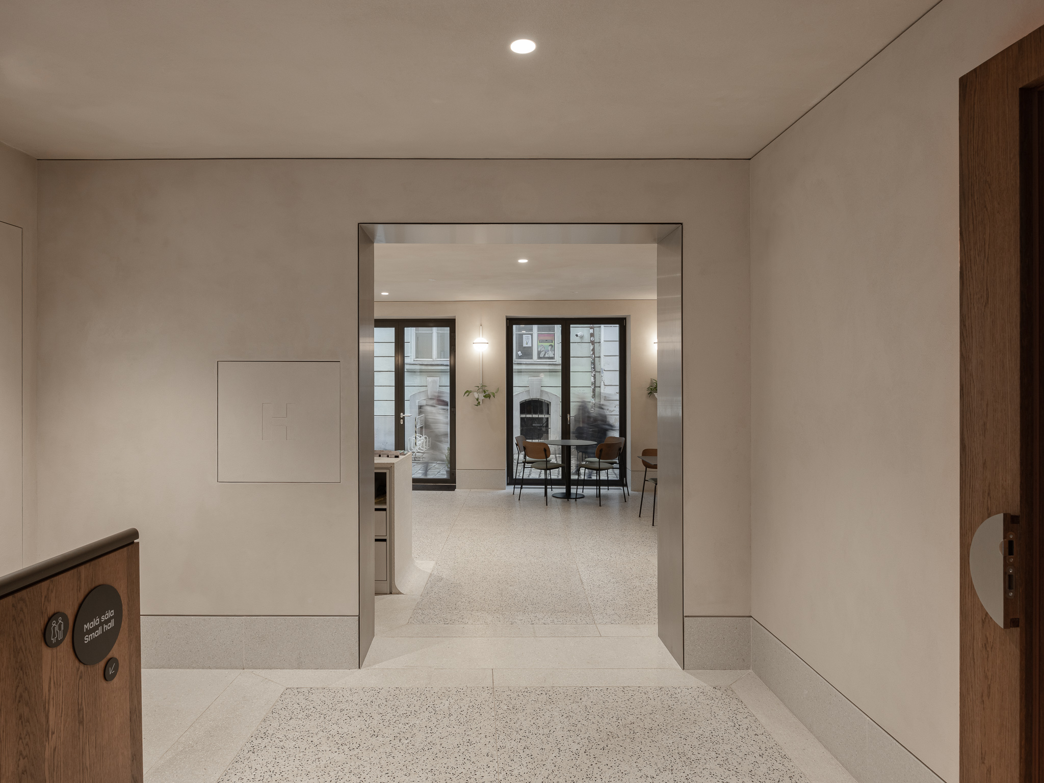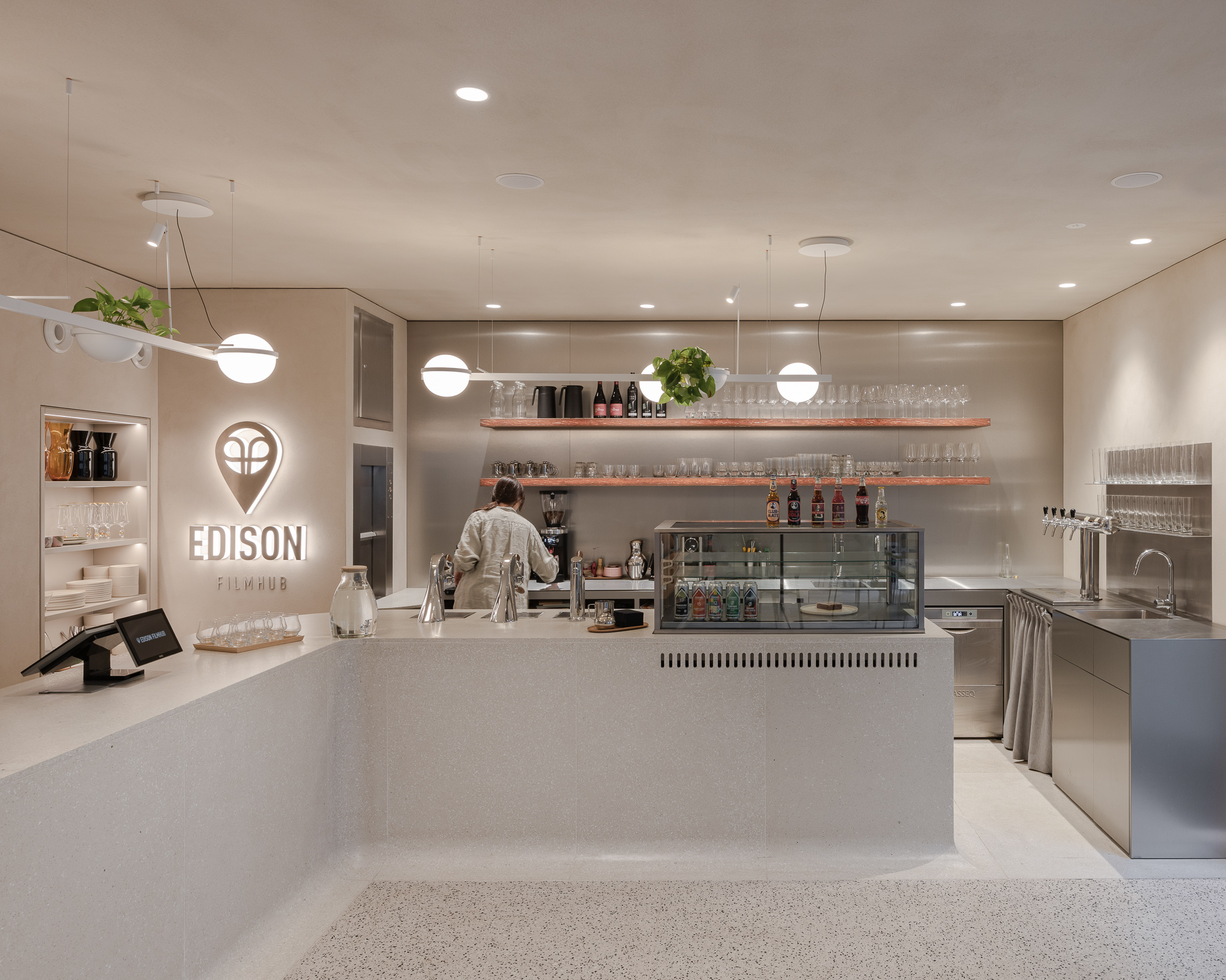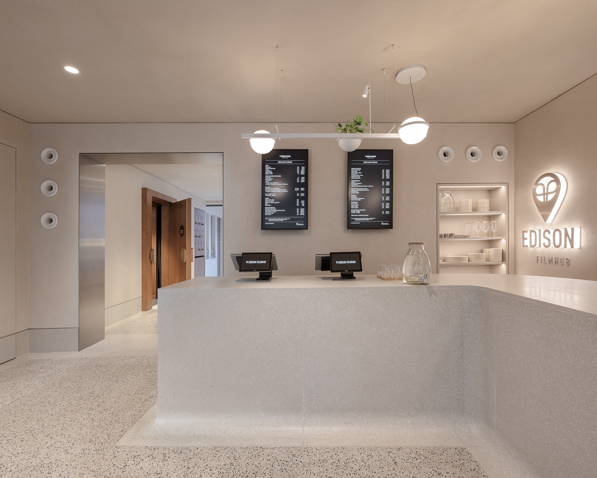 Vstupuje sa priamo do kaviarne, ktorej dominuje barový pult v pôdorysnom tvare L. Portálom lemovaným brúseným nerezovým plechom sa návštevník dostane bližšie k dvom sálam. Hlavná (veľká) sála pre 50 divákov je prístupná z nadväzujúceho priestoru malej haly, ktorou sa ďalej pokračuje do átria. V átriu sa počíta s exteriérovým sedením pre kaviareň a je ním prístupná spomínaná galéria a administratívne priestory Edisonu. Malá sála pre 20 ľudí je dostupná schodiskom. Nachádza sa v podzemných priestoroch, spolu s toaletami pre hostí a prípravovňou studených jedál. Sály sú tmavé, zelené sedadlá s výsuvnými poznámkovými stolčekmi sú spolu s jemnými, podsvietenými drevenými hranolčekmi jediným farebným akcentom priestorov. Spoločenské a rozptylové priestory sú farebne neutrálne, podlaha s barom sú z terrazza, steny jemne okrové. Vstupné dvere do sál, masívne zábradlia dvoch schodísk a vstavaný nábytok (šatník, mobilný bar) sú dyhované tmavo moreným dubom.