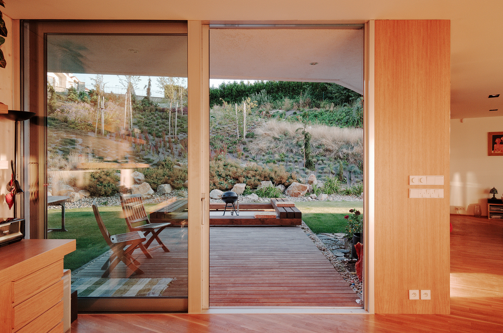 1. Južná záhrada je najintímnejšia, uzatvorená svahom a samotným domom. Ústia do nej všetky denné miestnosti a spálne.