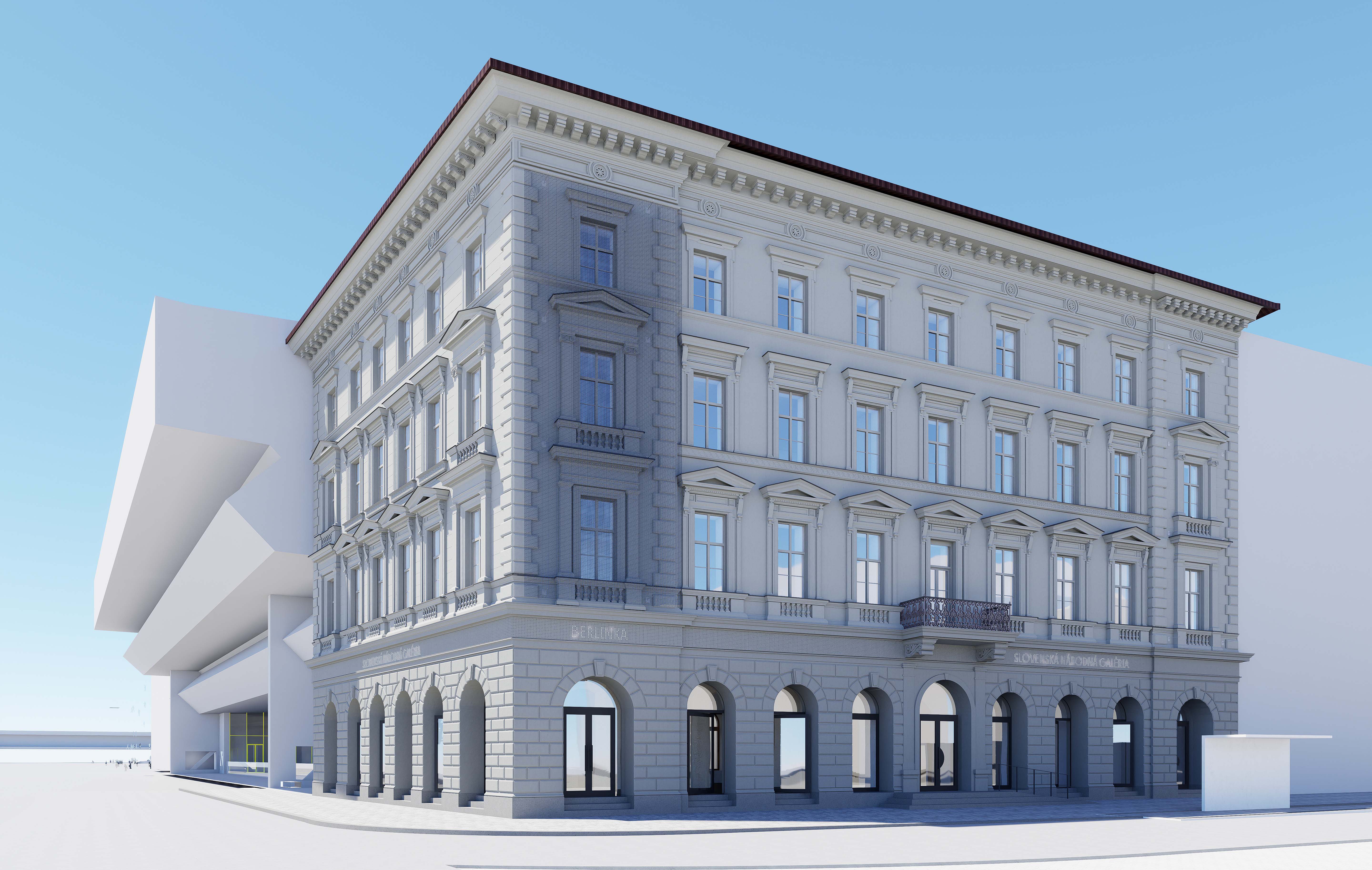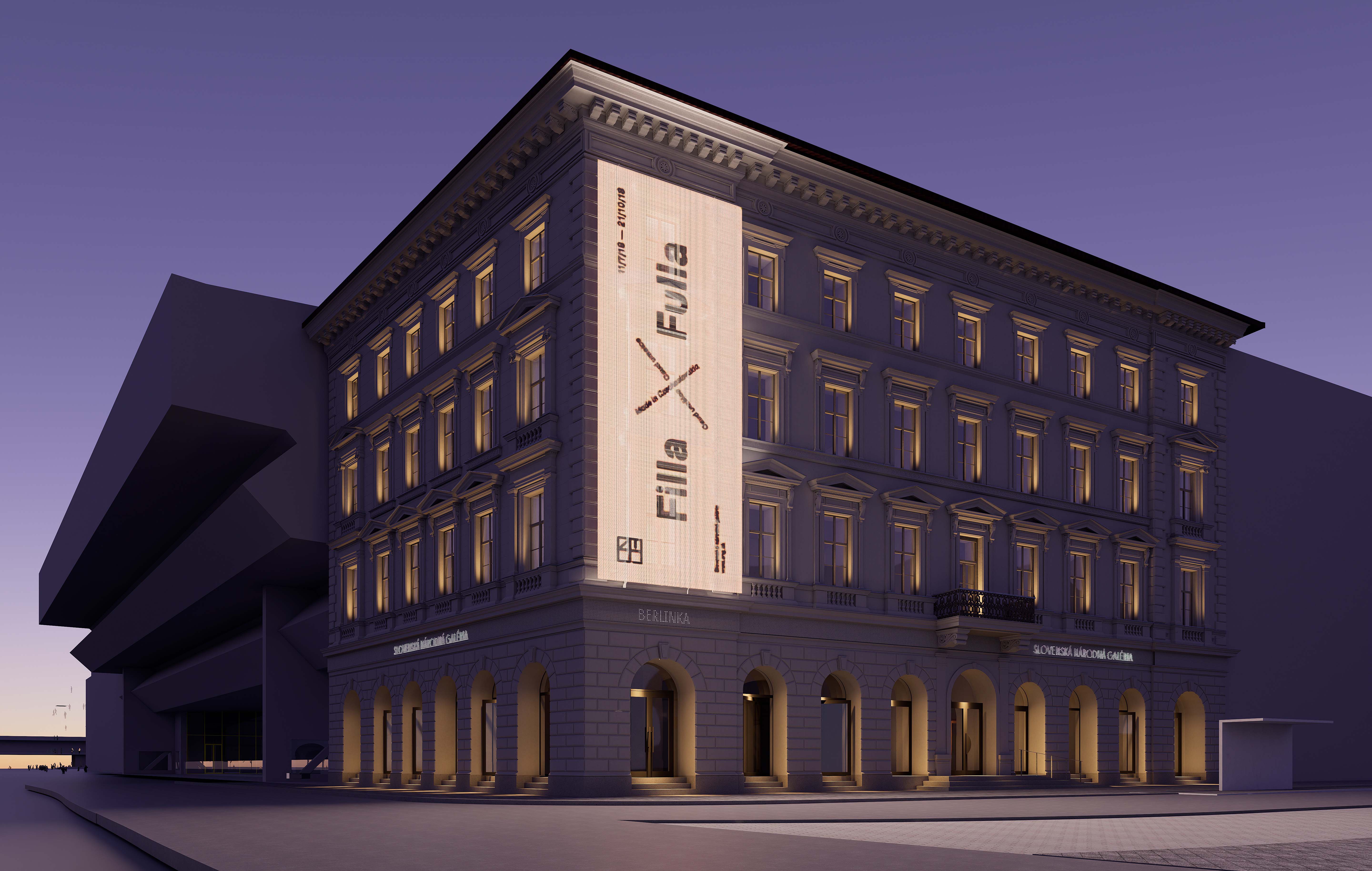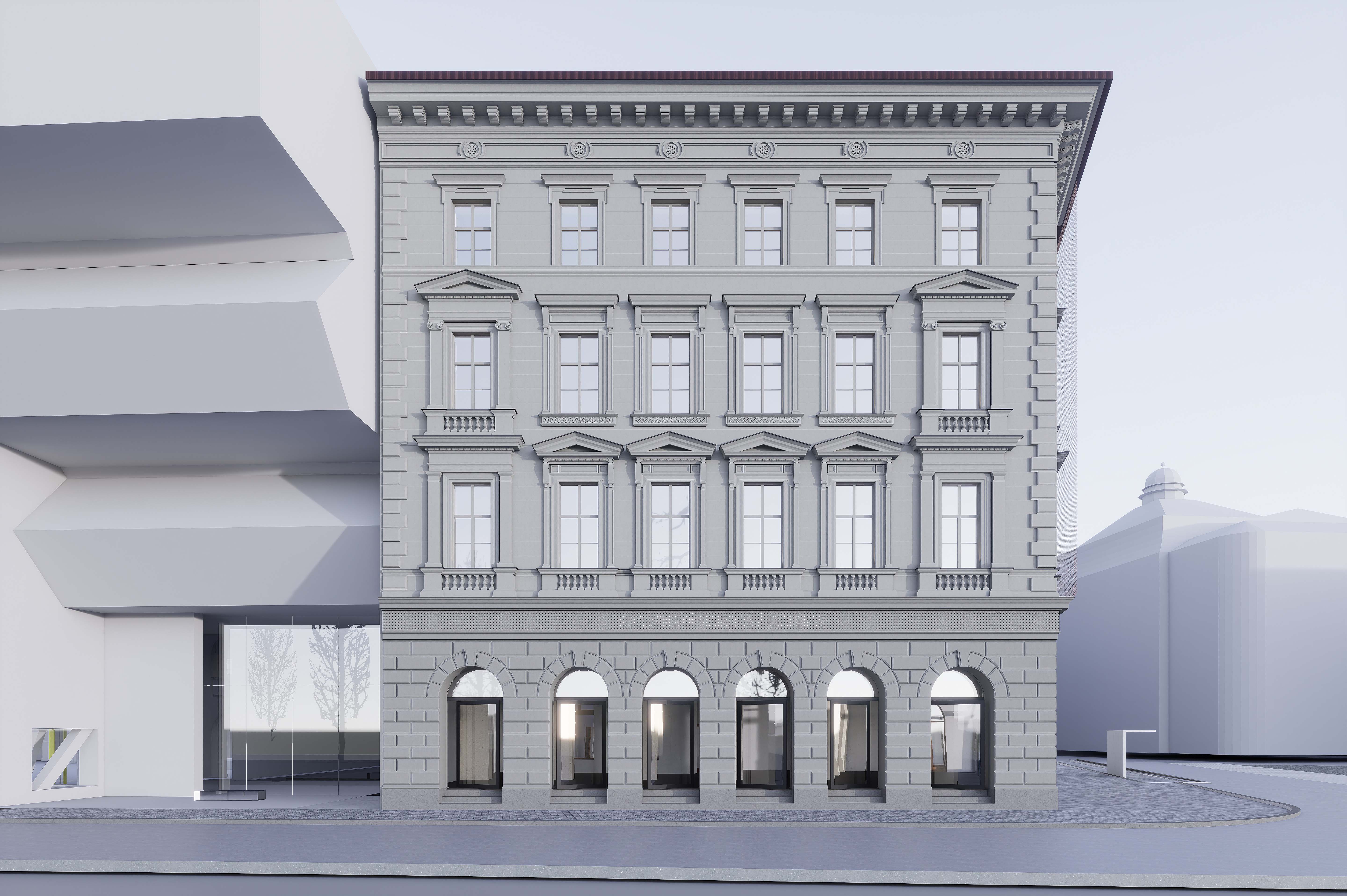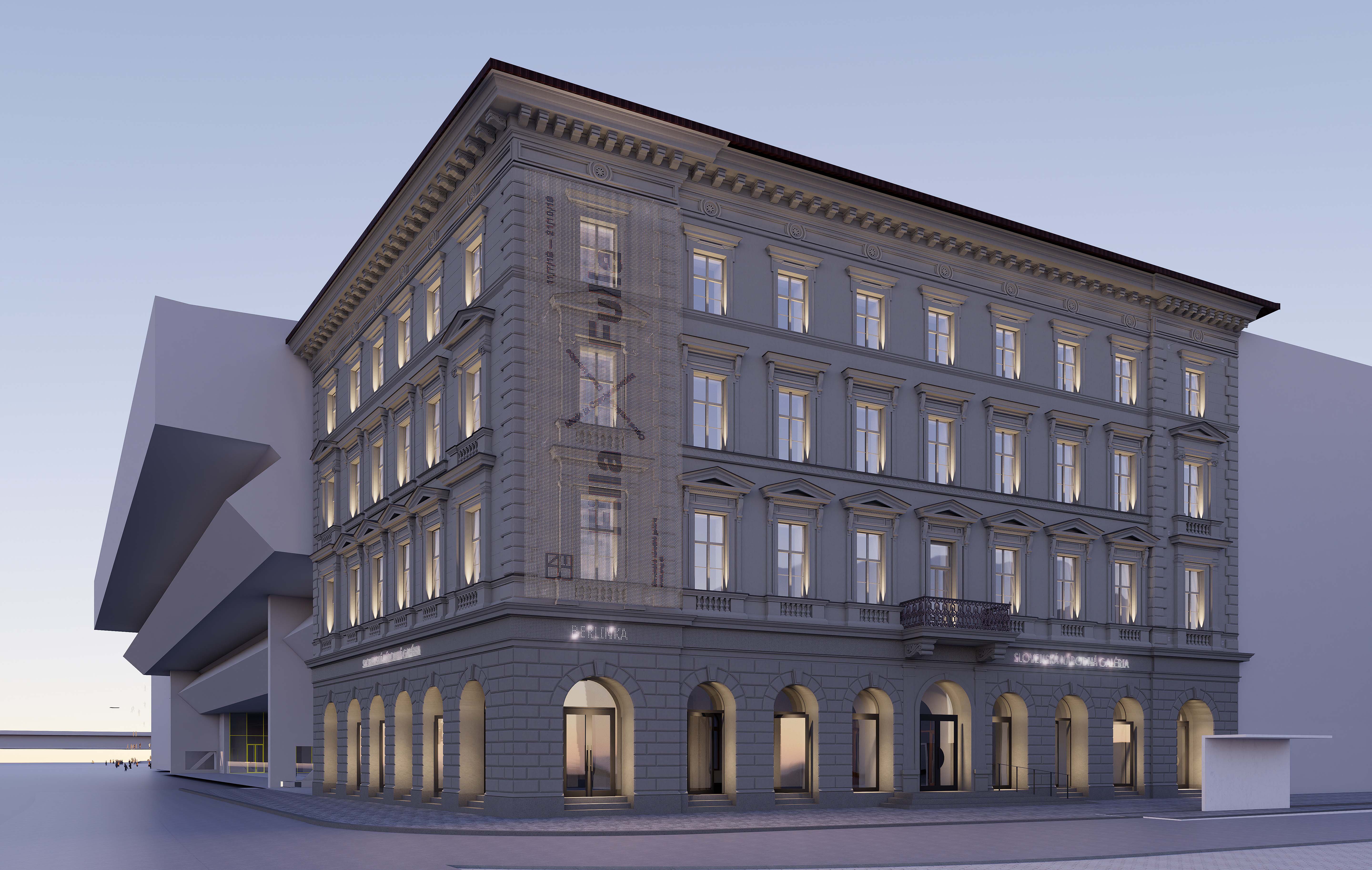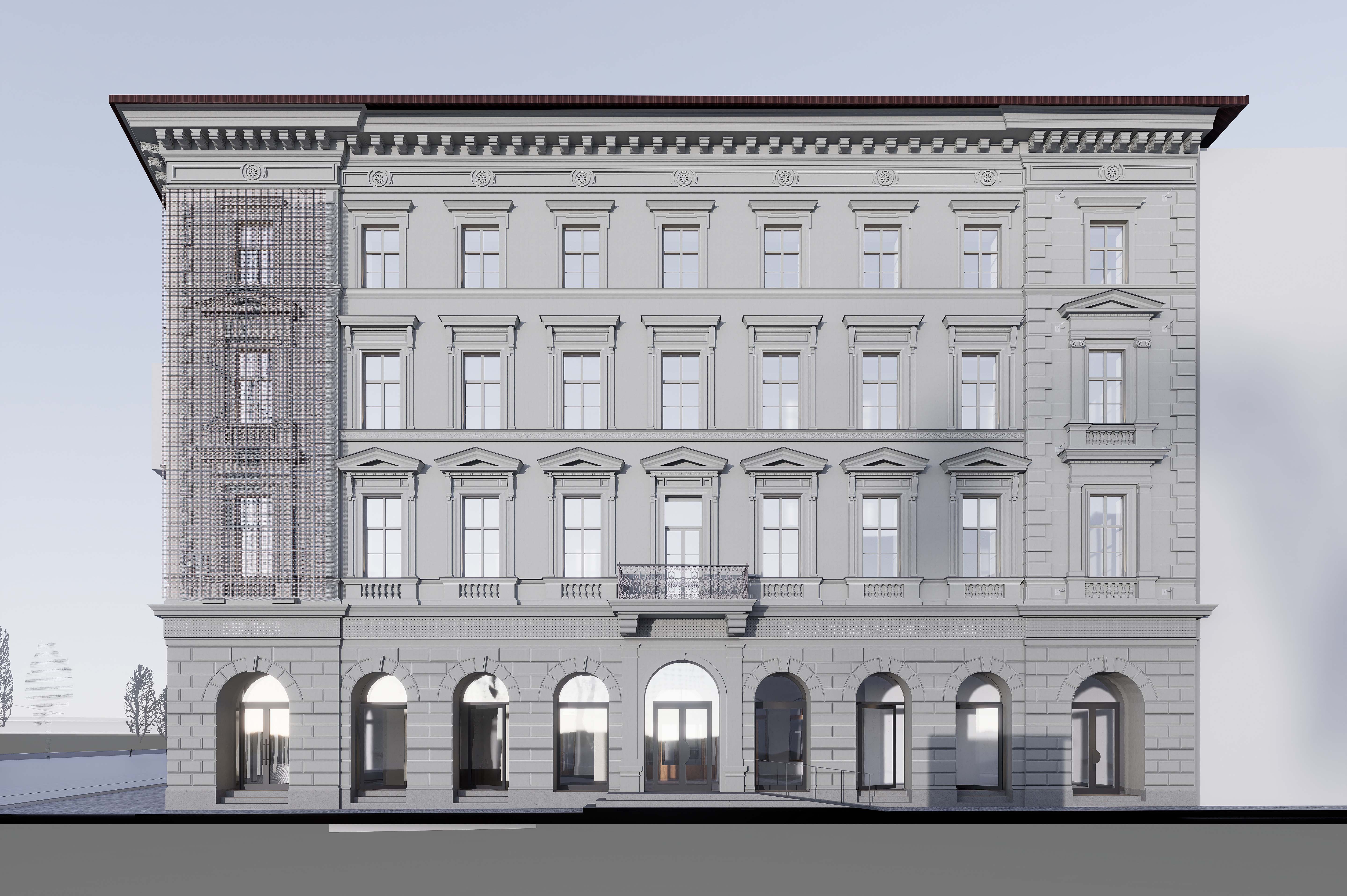 Nahradenie výplne rímsy digitálnym LED panelom vytvára dynamický prvok, ktorý komunikuje s verejnosťou pomocou svetelných vzorov a informácií. LED panel prináša moderný vizuálny jazyk, čím obohacuje fasádu o novú dimenziu a vytvára kontrast medzi historickým vzhľadom a súčasným obsahom. Digitálny panel môže slúžiť na propagáciu výstav, čím sa eliminuje potreba tradičných reklamných bannerov, ktoré budú nahradené zredukovaným systémom.