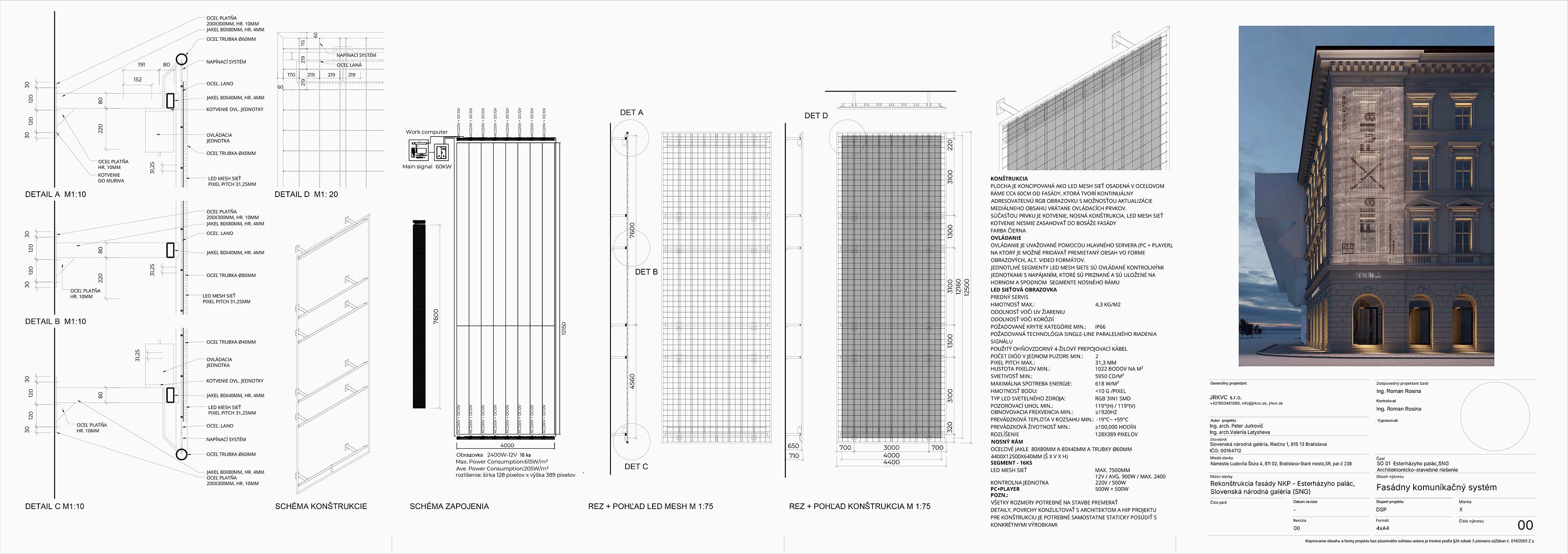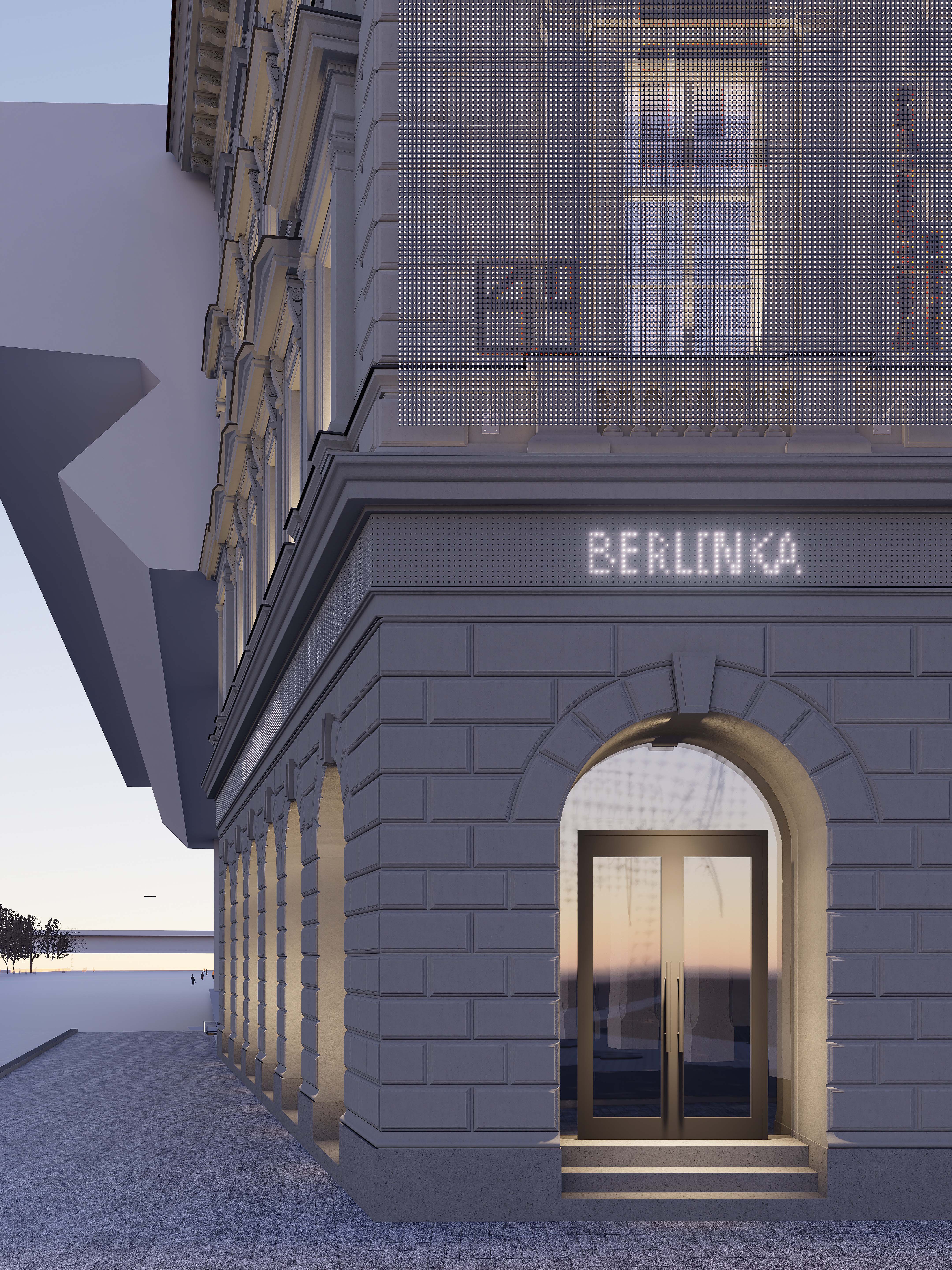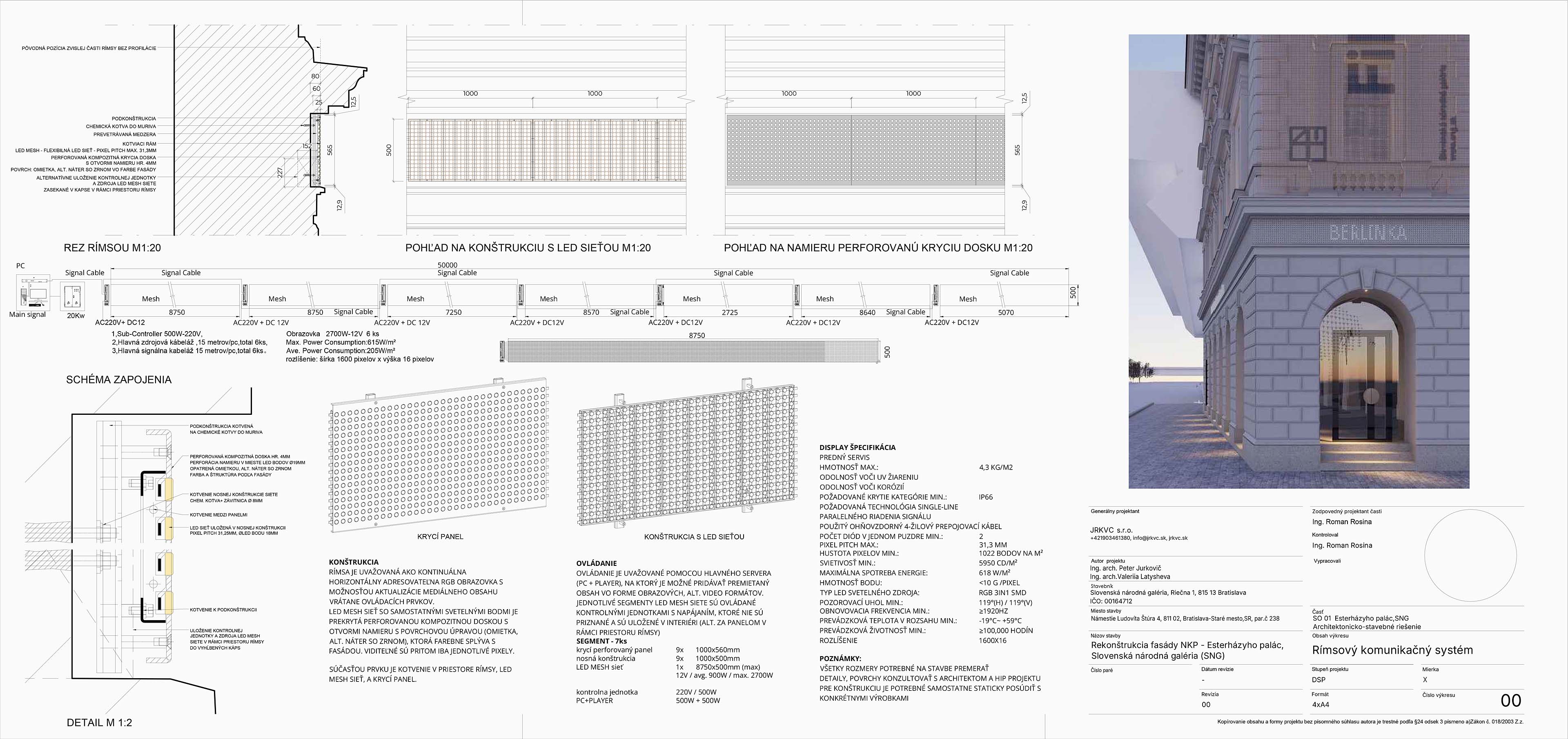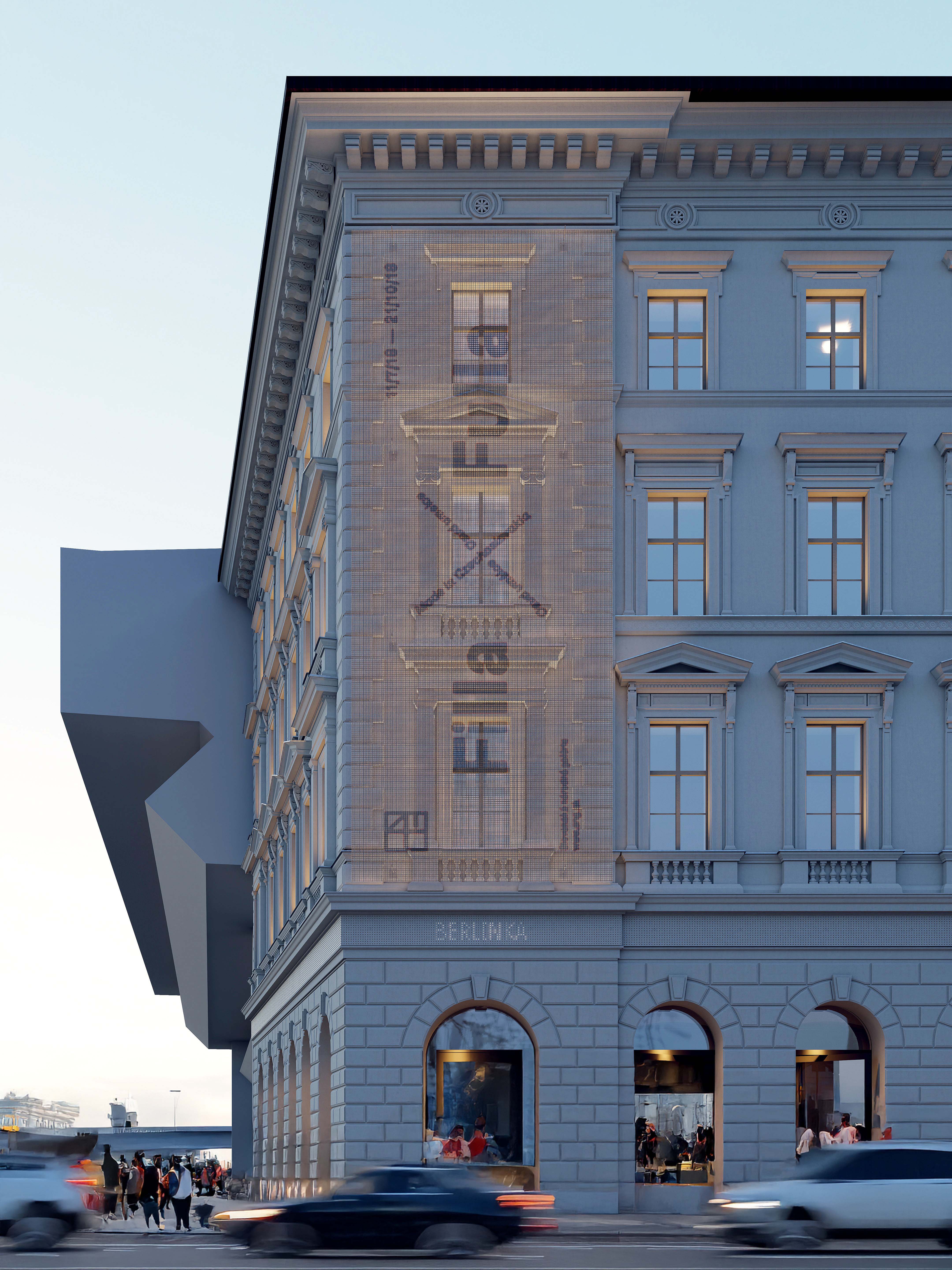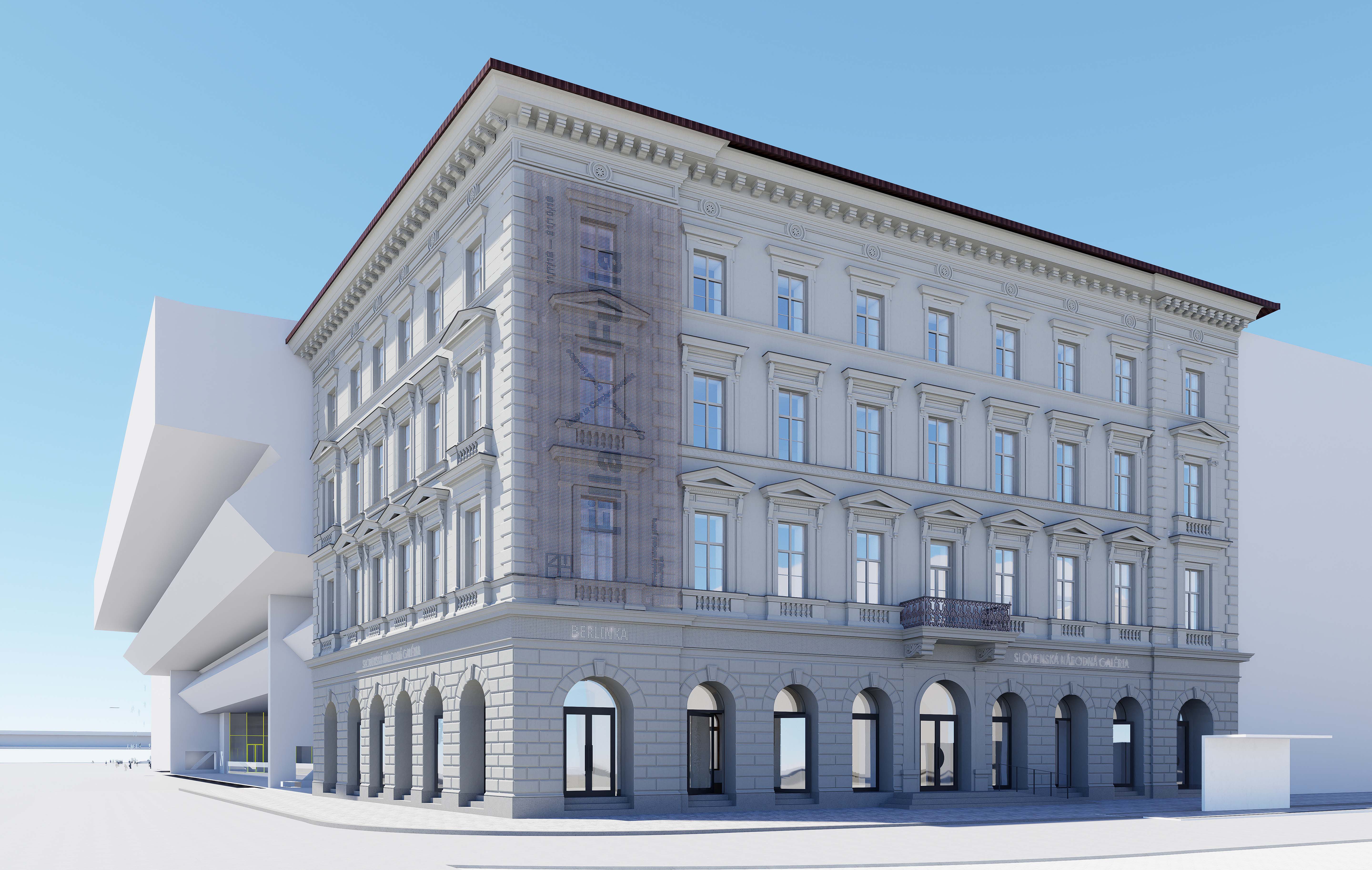 Nahradenie výplne rímsy digitálnym LED panelom vytvára dynamický prvok, ktorý komunikuje s verejnosťou pomocou svetelných vzorov a informácií. LED panel prináša moderný vizuálny jazyk, čím obohacuje fasádu o novú dimenziu a vytvára kontrast medzi historickým vzhľadom a súčasným obsahom. Digitálny panel môže slúžiť na propagáciu výstav, čím sa eliminuje potreba tradičných reklamných bannerov, ktoré budú nahradené zredukovaným systémom.