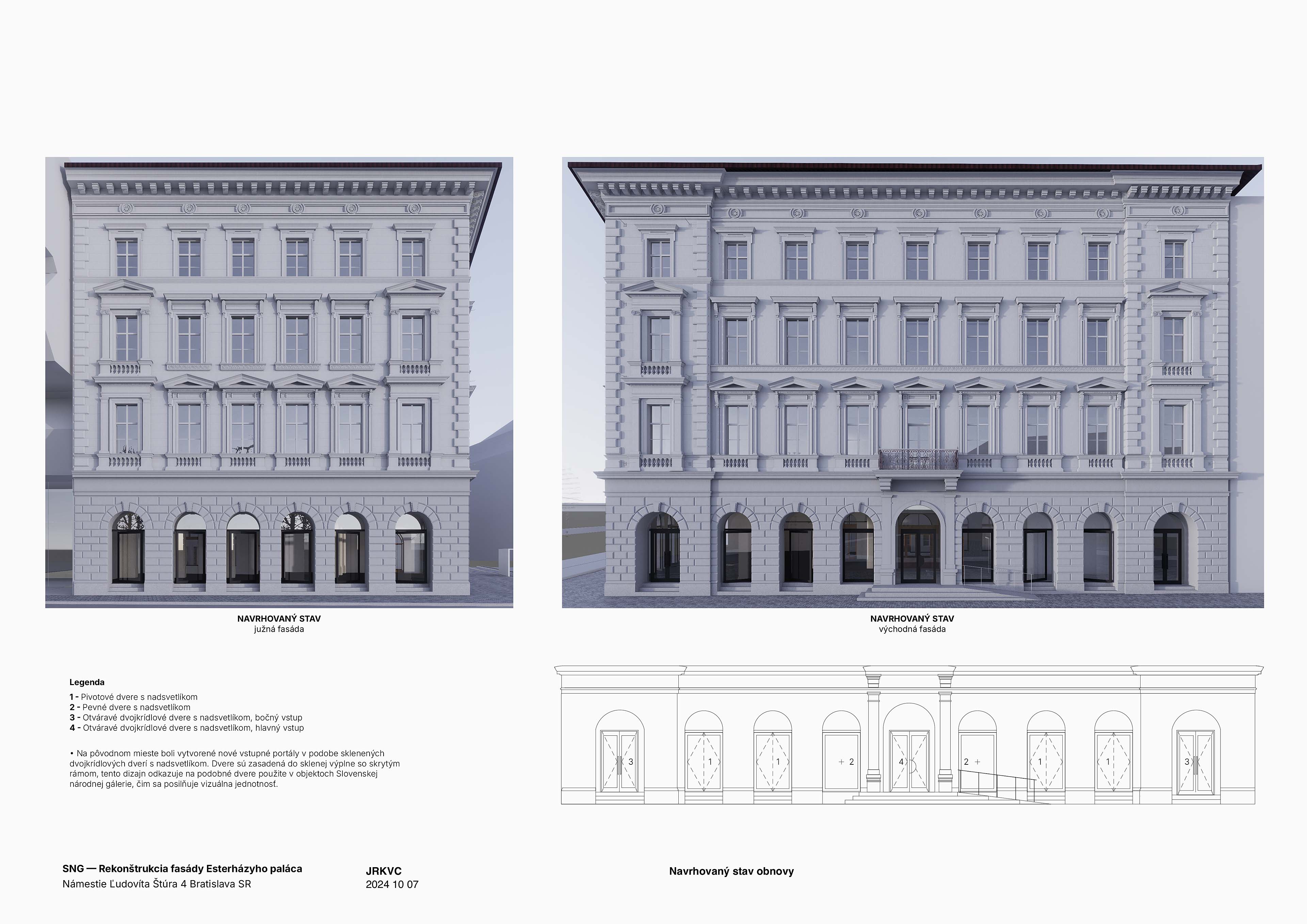 Architektonická štúdia sa zameriava na rekonštrukciu fasády Esterházyho paláca, ktorý viackrát menil svoj vzhľad podľa zmien funkčného využitia. Dnes patrí Slovenskej národnej galérii a je súčasťou jej komplexu. Budova predstavuje vzácny príklad neorenesančného slohu v Bratislave. Návrh revitalizuje fasádu pri zachovaní pôvodného charakteru a otvára parter smerom k ulici, čím posilňuje spojenie s verejným priestorom. Cieľom je zachovať a obnoviť pôvodný vzhľad, očistiťfasádu a esteticky ju zjednotiť. Hlavná pozornosť sa venuje parteru, kde jemné zásahy zlepšujú prepojenie interiéru s exteriérom, čím sa zvyšuje interakcia budovy s verejnosťou a jej prepojenie s komplexom. Farebné zjednotenie a návrat k pôvodnému členeniu okien vytvára harmóniu s galériou, pričom digitálne prvky prinášajú modernú formu komunikácie a reflektujú aktuálnu úlohu objektu.